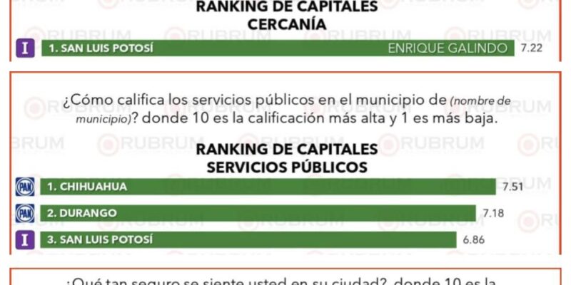 DestacadaMetrópoliSLP Enrique Galindo, Alcalde líder en desempeño y cercanía con los potosinos junio 10, 202599 views0 Share By admin Share *Ciudadanía encuestada por Rubrum lo ubica en el sitio 1 en cuanto a su trabajo y por su acercamiento con la ciudadanía.*San Luis Capital ocupó el tercer sitio por los Servicios Públicos y quinto por Percepción de Seguridad. La empresa Rubrum, en su evaluación ciudadana en 31 capitales estatales correspondiente a junio de 2025, posicionó al Presidente Municipal Enrique Galindo Ceballos en el primer lugar gracias a la alta calificación de 7.50, otorgada por la población, debido a su trabajo y desempeño como Alcalde de la Capital potosina. De igual manera, la calificación de cercanía del Presidente Municipal con la población de San Luis alcanzó un 7.22, lo que le posicionó también en el sitio número 1 a nivel nacional, de acuerdo con esta encuesta en la que sus habitantes valoran el desempeño de los Alcaldes, de sus oficinas municipales y de toda la estructura encargada de atender estas ciudades. En cuanto a los Servicios Públicos, San Luis Capital se ubicó en tercer lugar gracias a la calificación de 6.86 dada por las potosinas y potosinos; mientras que respecto de la Percepción Ciudadana de Seguridad se ubicó en la quinta posición debido a que la población le otorgó un 6.42 de calificación. Comparte esto: Comparte en Facebook (Se abre en una ventana nueva) Facebook Compartir en X (Se abre en una ventana nueva) X Comparte ¿Qué Opinas? excelente 0 Feliz 0 Me gusta 0 Podría mejorar 0 En otra ocasión 0